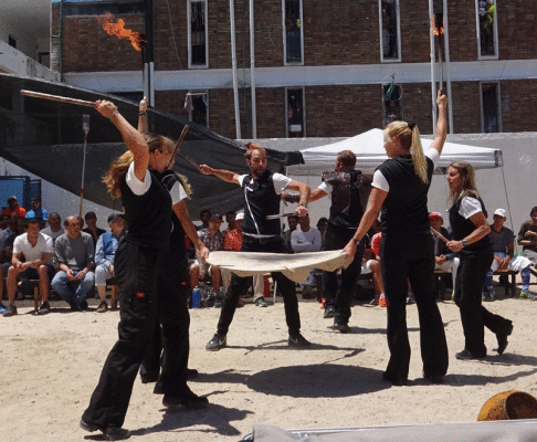 By brother does an act with a birimabu, a Brazilian instrument used in the martial art of Capoeira. He teaches how we each have our own rhythm and to be an individual , not go with the crowd. In the dance we use fire torches and he spins a fire rod. Its really awesome! Afterward we bring up a number of men to “play” Capoeira with us and it is a time when everyone has fun, and the whole crowd claps and gets into it.