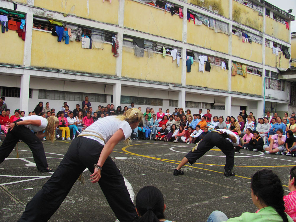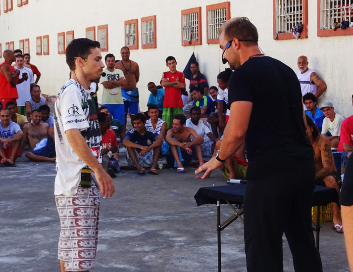At a prison in Uruguay, we were performing in a large field for 800 men. The performance was going good and everyone was into it. Then, in the middle of a Capoeira performances, my brother did a flip and when he landed he tore his achilles tendon. They gave us emergency care there at the prison and then we went to a hospital in Montevideo. The next day we had another performance scheduled at another prison and I invited he stayed to rest, but he wouldn’t hear of it:) So we pushed him in a wheel chair and it meant the world to the guys that he came anyway.