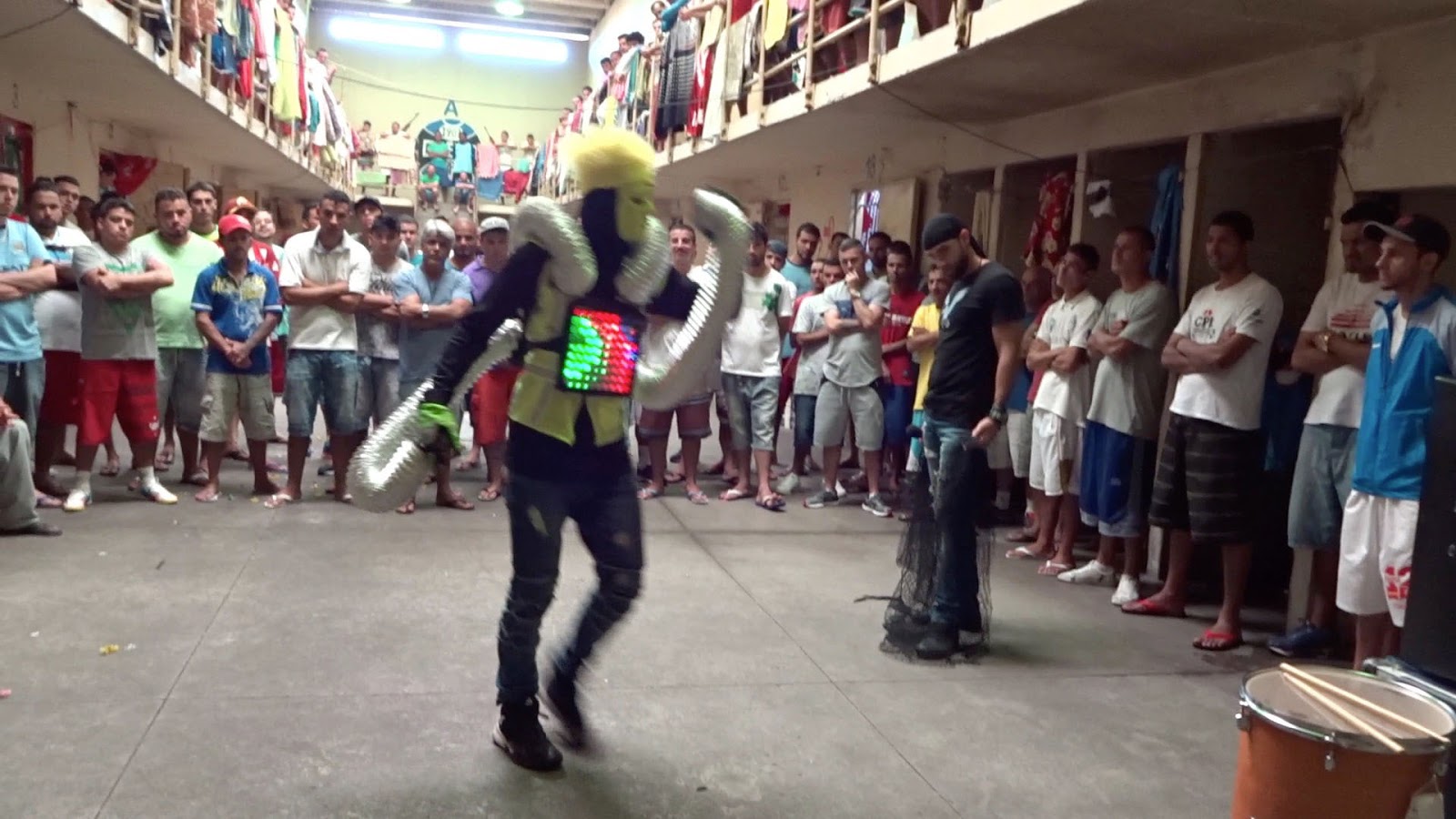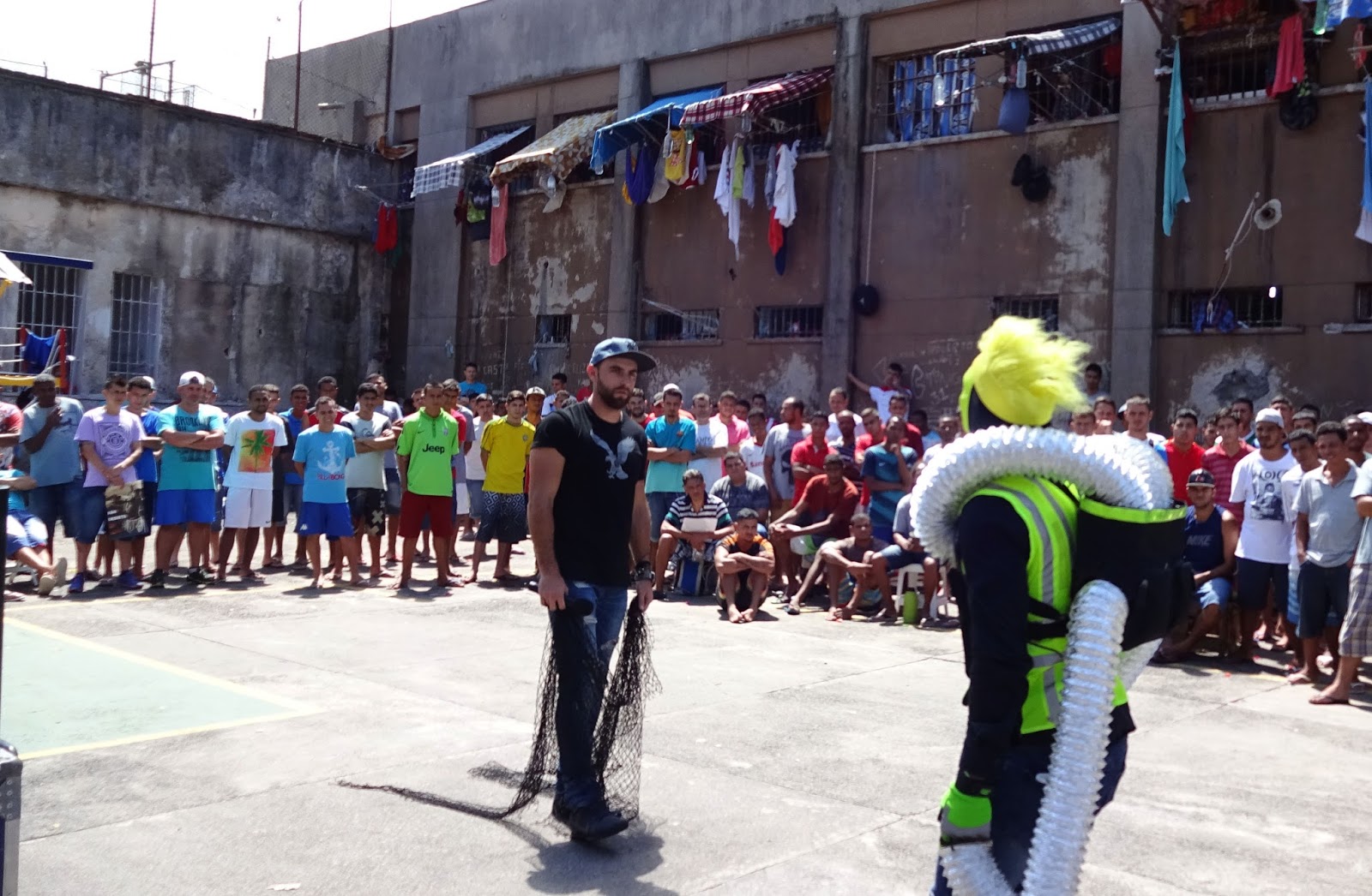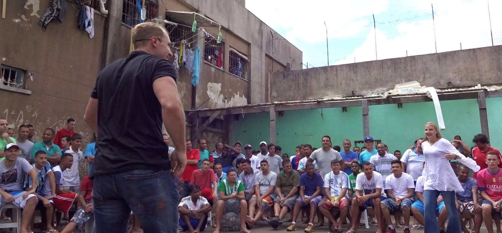 We frequently visit one of the largest and worst prisons in Brazil. One day, when we were scheduled to visit, a certain patio, a part of the building structure had just collapsed and a major sewer pipe had broken. All the guys had to bring their stuff onto the outdoor part to try to clean it and everything was a disaster. The smell was just horrible. But the men had been anticipating our visit and really wanted a break from the nightmare that is their usual reality, so we decided we would figure out how to work around everything so we could give them a little laughter and hope. We arranged a certain area for them to sit and then brought all our equipment in. Its like as soon as we turned the music on, they got to travel to another places and leave the horror of these walls. We made them laugh a lot which makes me so happy.