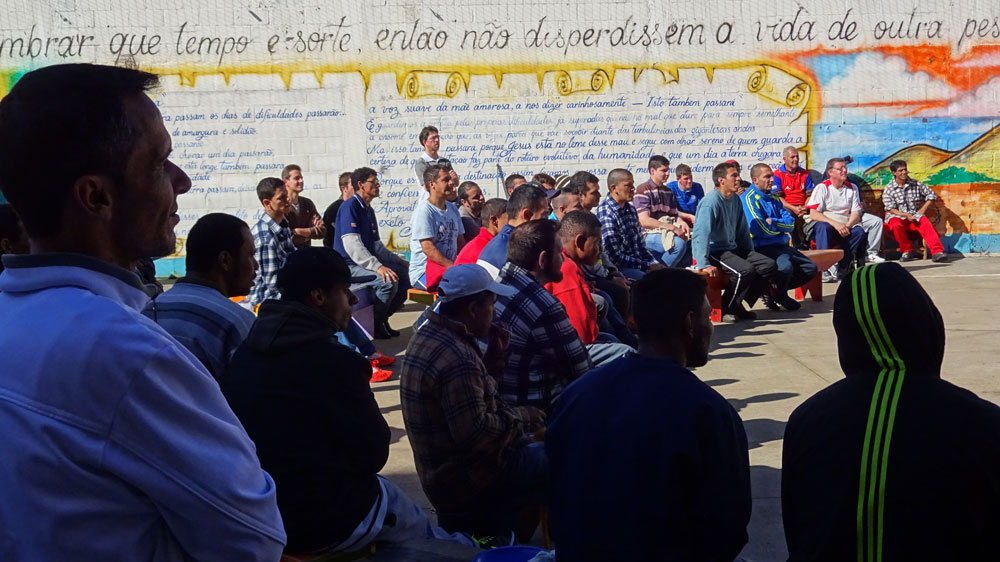 We do an act where one of us wears the costume of a homeless man and walks about begging. I am in the back ground acting as an artist, drawing the homeless man. I watch as a man ignores him and won’t help (one of my brothers playing the part) and then finally a young man stops, gives him his coat and cares for him (another one of my siblings plays the part). At the end I, as the artist, show the picture that I have been “drawing” and it is of the face of Jesus, conveying what Jesus said, “whatever you do to the least of My brothers, you do to Me. (Mt.25:40)” This is always a very powerful theatrical act and encourages others to care about each other and to care for those less fortunate. When we did this act for the first time here in Brazil, as my brother was acting homeless and begging, people from the crowd came out to give him something and care! They wanted to show they got it. One of the guys that came up was actually homeless himself, and had a few extra coins. We also do a version of this in prisons where instead of conveying a homeless man, we convey a prisoner who is sad and another prisoner cares about him. It is the default of our nature to think and care about ourselves. We can become consumed with our problems even if the guy next to us has it ten times worse. The Gospel calls us to forget about ourselves and love others. That is true fulfillment and joy.