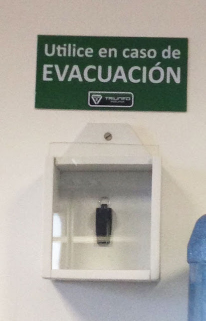 s a whistle. Check out this picture my brother snapped when we were waiting in a government building. The sign says, ” Use in case of evacuation” and the little black thing in the glass is a whistle. No kidding. Well I definitely feel safe knowing that I am in an earthquake zone and this buildings evacuation plan is someone breaking the glass to blow a whistle!!! Because when you’re three floors up and the building starts to shake and things are falling, hopefully you will hear the guy on the first floor blowing a whistle which will let you know you should get out (because obviously you had not already thought you should get out of a moving building).