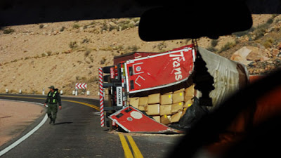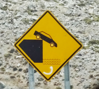 ally scare the heck out of you. Like this one which would mean: “Caution or your car will fly off a cliff and plummet into a river”. And then we come around a bend and see this semi tipped over and realize its no joke.
